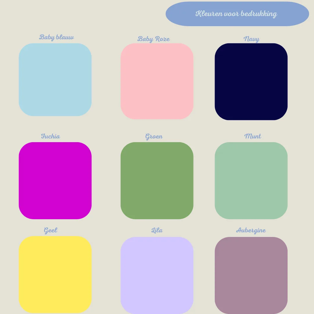 babyroze, fuchsia, babyblauw, navy, munt, groen, geel, lila, aubergine
