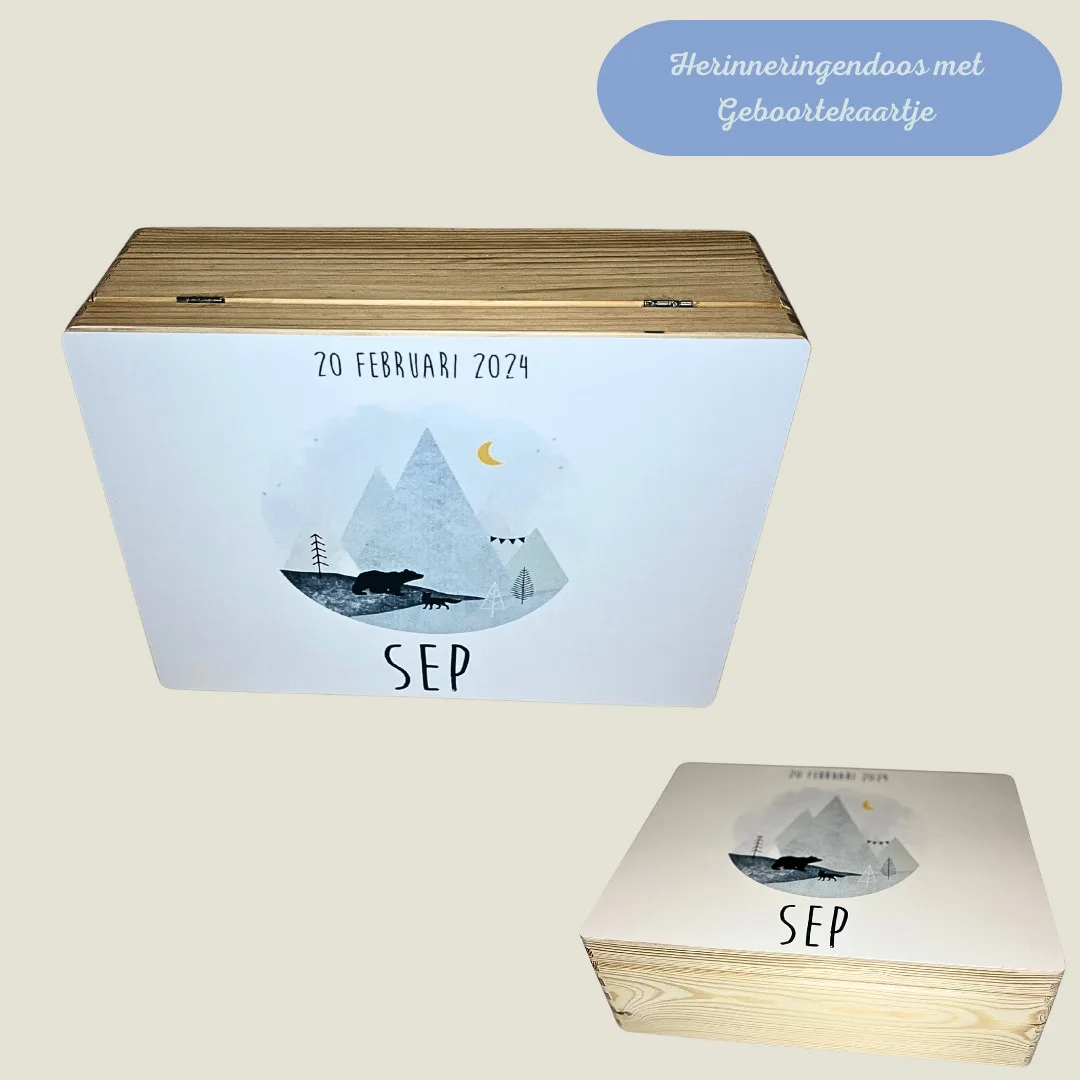 Deze prachtige houten kisten komen in 3 varianten: Small, Midi en Groot. Deze zijn speciaal gemaakt om al de herinneringen van jou kleintje te bewaren en te koesteren. Van het eerste tutje tot diploma’s. Je hebt verschillende mogelijkheden om ze te personaliseren: Je kan ze laten bedrukken adhv het geboortekaartje, met de naam, met houten letters of laten graveren.